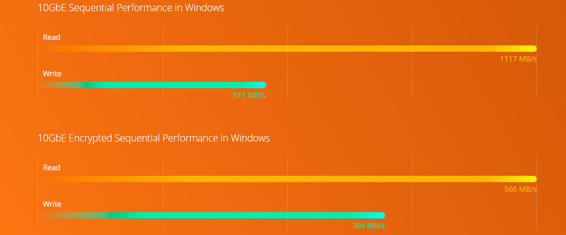 Possibilita velocidades de transferência com 10GbE até 1117MB/s de leitura e até 511MB/s de gravação, com criptografia até 566MB/s de leitura e até 394MB/s de gravação.