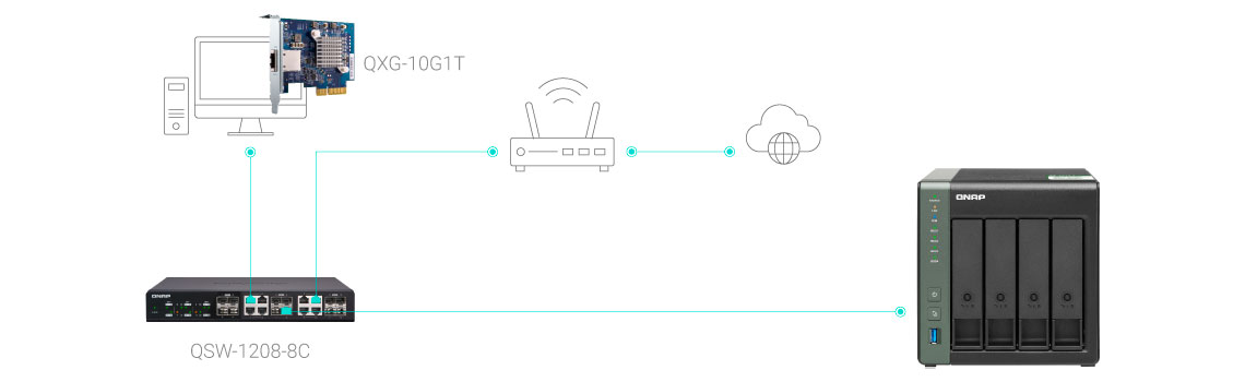 A rede de 10GbE melhora o desempenho geral da rede e otimiza as tarefas diárias pois possui 10 vezes a banda larga de 1GbE. O NAS TS-431KX de 10GbE fornece uma variedade de tudo o que é necessário para montar o ambiente de rede de 10GbE, desde comutadores até adaptadores de rede.