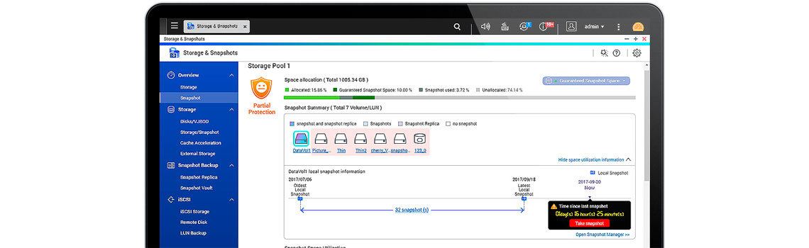 Os snapshots da Qnap são baseados em bloco e registram apenas dados modificados. Isso economiza espaço de armazenamento e reduz o tempo de realizar backup e restaurar dados. O TS-431KX pode suportar até 32 snapshots por volume ou LUN e até 64 no total.
