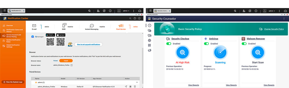 O Notification Center é uma solução oferecida pelo sistema QTS para consolidar todos os eventos e alertas em um único aplicativo de notificações. O Conselheiro de Segurança pode avaliar e recomendar as configurações de segurança do NAS TS-431KX para aprimorar sua segurança.