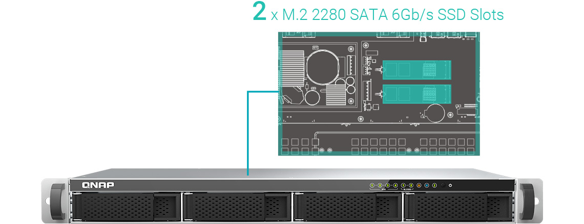 Além de usar SSDs de 2,5 polegadas para aceleração de cache, o storage possui 2 slots M.2 SSD que possibilitam instalar SSDs SATA 6Gb / s M.2 com formato 2280 (vendidos separadamente).