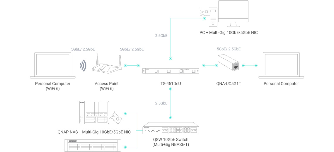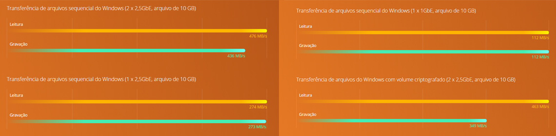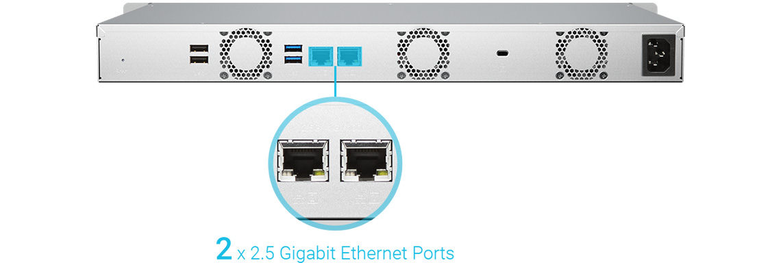 O TS-451DeU vem com 2 portas LAN 2.5GbE RJ45 que possibilitam o uso de cabos CAT5e existentes para atualizar as velocidades da rede de 1 Gigabit para 2,5 Gigabit. As portas duplas de 2,5 GbE também suportam entroncamento de portas para velocidades de transmissão de até 5 Gbps.