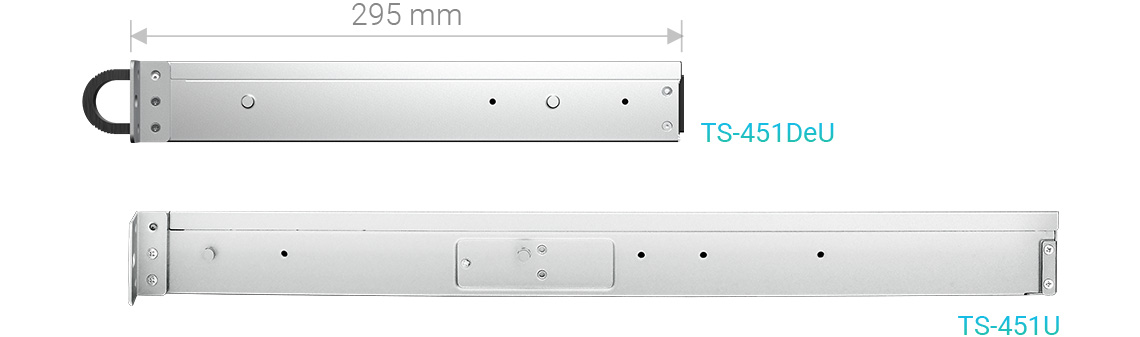 Semelhante a um NAS comum e de formato em rack de 4 discos, o TS-451DeU compacto tem uma profundidade de apenas 11,57 polegadas (295 mm), tornando o storage uma excelente opção para pequenos racks, e o espaço não usado pode ser reservado para cabeamento ou ventilação.