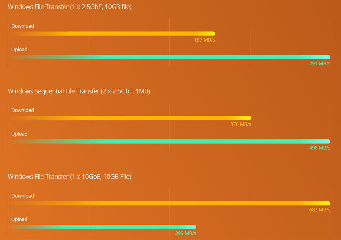 O TS-653D disponibiliza 2 portas LAN RJ45 2,5GbE que possibilitam utilizar cabos CAT5e existentes para aumentar a velocidade de rede de 1 Gigabit para 2,5 Gigabits.