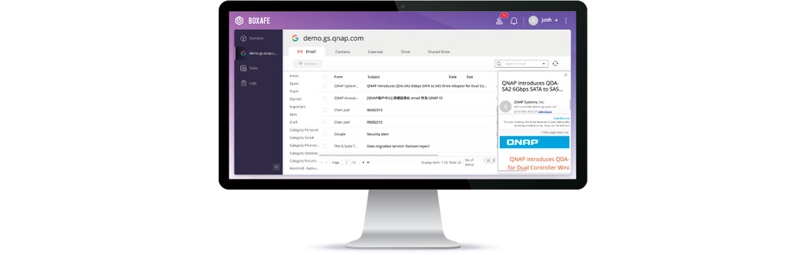 O TS-832PXU-RP inclui o QNAP Boxafe, que realiza o backup de arquivos, e-mails, calendários e contatos do Google G Suite e do Microsoft 365, proporcionando uma camada extra de proteção para os dados empresariais na nuvem.