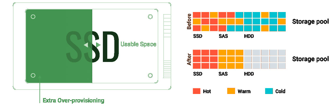 Prolongue a vida útil dos SSDs: O superprovisionamento extra de SSD permite adicionar de 1 a 60% de espaço reservado para evitar a deterioração do desempenho, ajudando a aumentar a estabilidade do sistema e prolongando a vida útil dos SSDs.