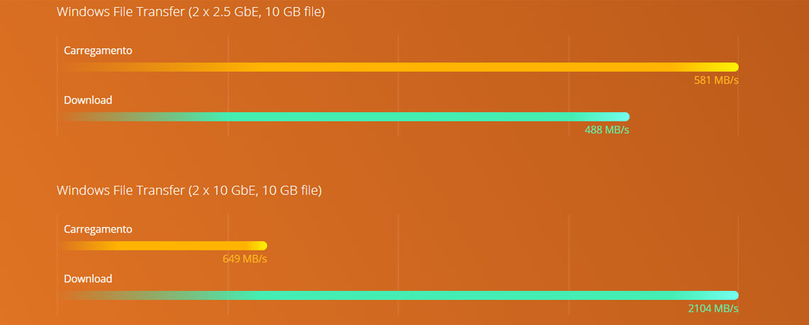 Com 2 portas de rede SFP+ 10GbE e 2 2,5GbE, o storage NAS oferece uma largura de banda incrível para possibilitar acesso a arquivos, backup/restauração e transferência de mídia de alta velocidade, além de permitir a alocação flexível de recursos de rede para aplicações e serviços individuais.