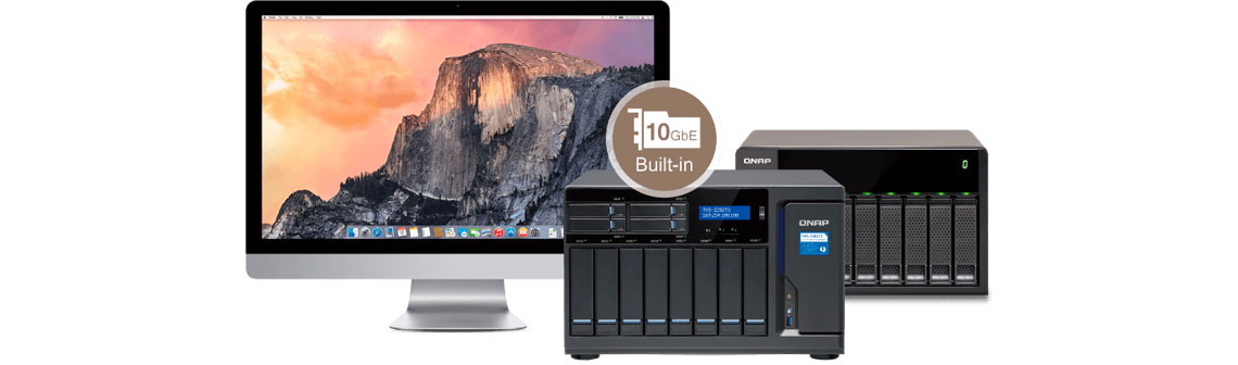 O TVS-1282T3 pode ser conectado com computadores Mac com entradas Thunderbolt (é necessário utilizar um adaptador para entradas Thunderbolt 2) ou com portas USB-C, como também se conecta a computadores Windows ou Linux com uma entrada 10GbE de alta velocidade.