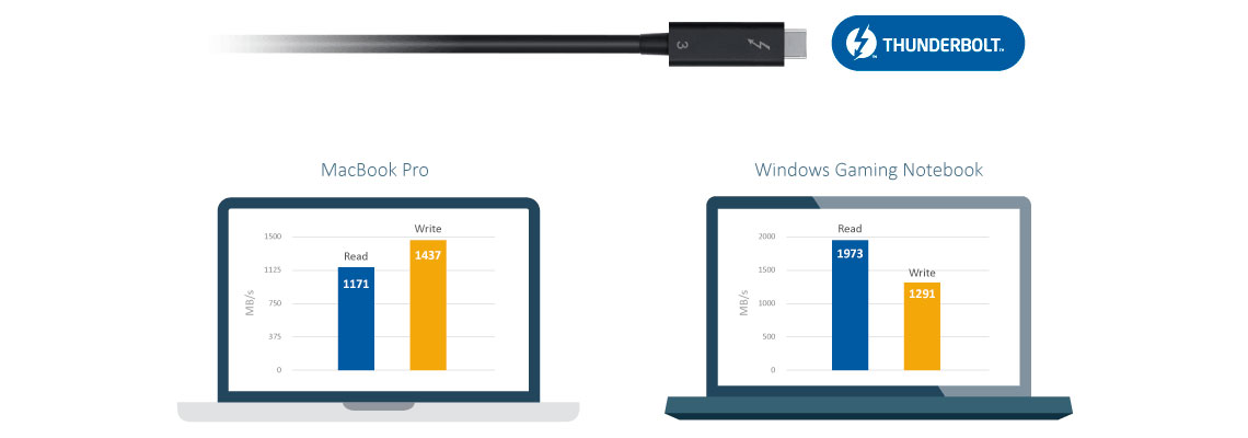 É possível usufruir do máximo de desempenho com as portas Thunderbolt 3 do TVS-1282T3, utilizando cabos certificado, que oferecem até 40Gbps de velocidade, podendo ampliar as taxas de leitura e escrita entre o storage e plataformas Windows ou Mac.