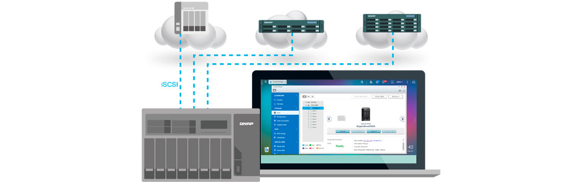 O TVS-1282T3 possui o recurso VJBOD (Virtual JBOD), para conectar vários storage da Qnap entre si. Volumes iSCSI LUN podem ser montados como discos locais e pools de armazenamento podem ser estabelecidos para diferentes usos.