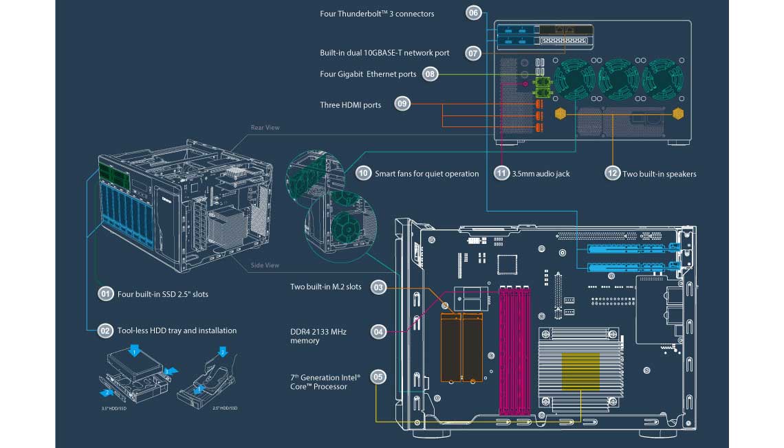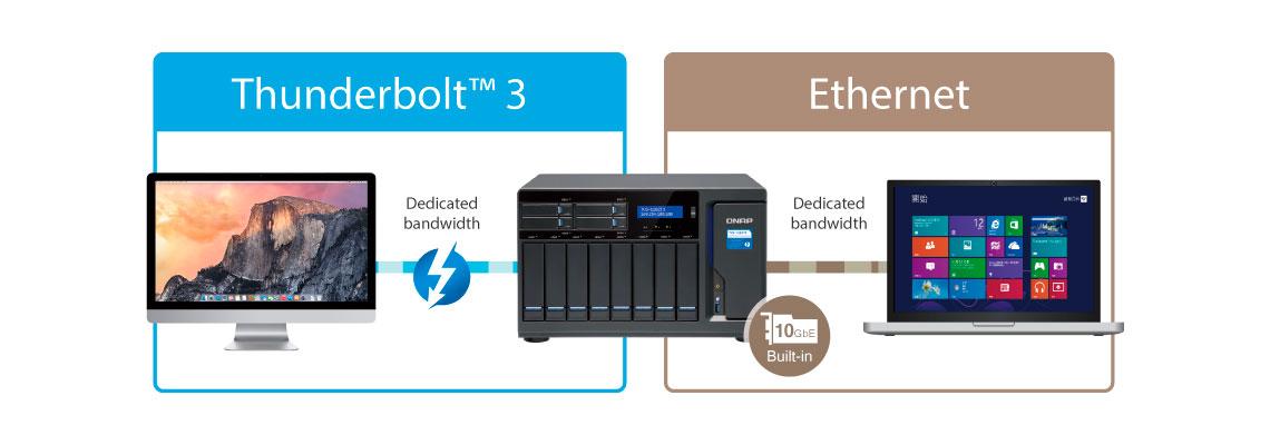 O TVS-1282T3 combina NAS, Thunderbolt e iSCSI SAN em uma única unidade e pode funcionar conectado a serviços Ethernet e Thunderbolt 3 completamente independente e sem interferência de banda.