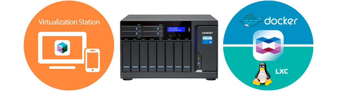 O Virtualization Station permite hospedar máquinas virtuais (VMs) no TVS-1282T3 e acessá-las via navegador web ou VNC. O Container Station integra tecnologias LXC e Docker lightweight, para executar sistema Linux isoladamente no storage, assim como permite downloads de aplicativos no Docker Hub Registry.