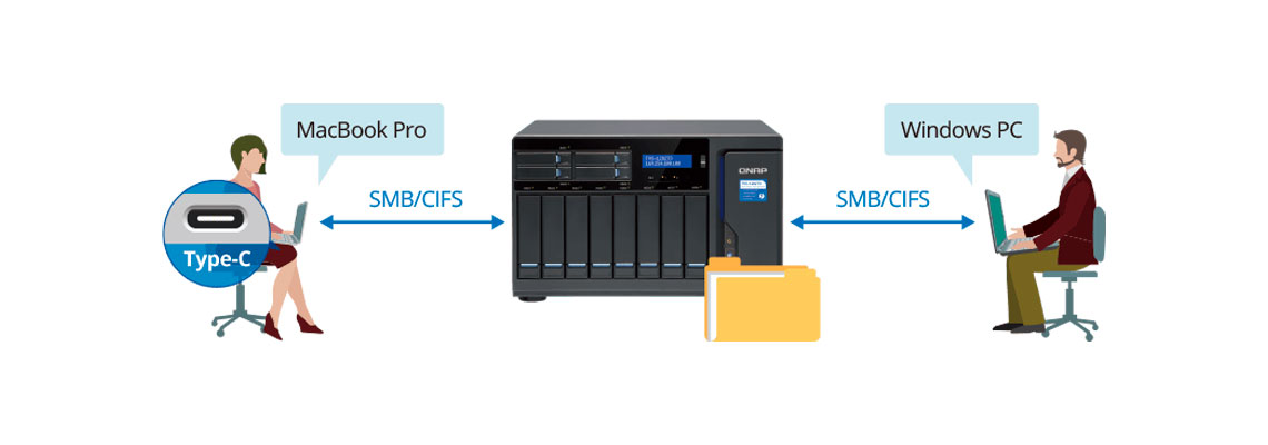 O TVS-1282T3 funciona em redes Ethernet para compartilhamento rápido de arquivos em múltiplos computadores. Independente do sistema operacional, é acompanhado dos protocolos SMB/CIFS, AFP e NFS para compatibilidade. O Qfinder Pro ajuda usuários a localizarem o TVS-1282T3, conectado aos computadores e possibilita localizar IPs Thunderbolt e Ethernet para compartilhamento de arquivos.