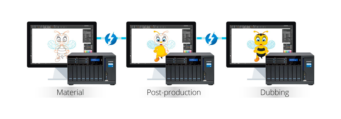 Geralmente utiliza-se várias estações de trabalho ao mesmo tempo para agilizar alguns projetos. Com o TVS-1282T3 você pode conectar essas estações separadamente via Thunderbolt 3, aproveitando a velocidade de conexão e capacidade do storage da QNAP.