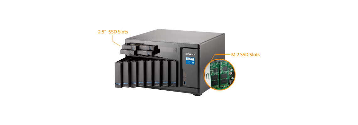O TVS-1282T3 possui 2 slots SSD dedicado para aumentar a performance de IOPS. As velocidades de transferência são mais rápidas e confiáveis através do compacto e eficiente M2. SSD.