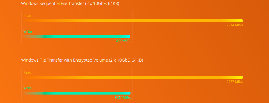 Equipado com processador de 8ª geração Intel Core i3-8100 Quad-Core 3,6GHz, até 64GB máxima de memória DDR4, 4 portas gigabit e 2 portas LAN 10GbE SFP+, o TVS-2472XU-RP oferece uma alta velocidade de transferência até 2214MB/s de leitura e até 1090MB/s de gravação. Com criptografia AES-NI fornece velocidades até 2077MB/s de leitura e 1027MB/s de gravação.