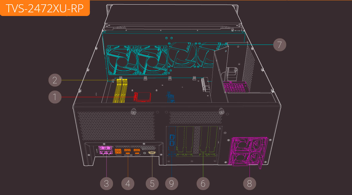 O TVS-2472XU-RP oferece slots PCIe para a instalação de uma placa de vídeo AMD Radeon ou NVIDIA para impulsionar o AI Machine Learning, enquanto oferece benefícios para processamento de imagens e desempenho de máquinas virtuais (Via GPU).