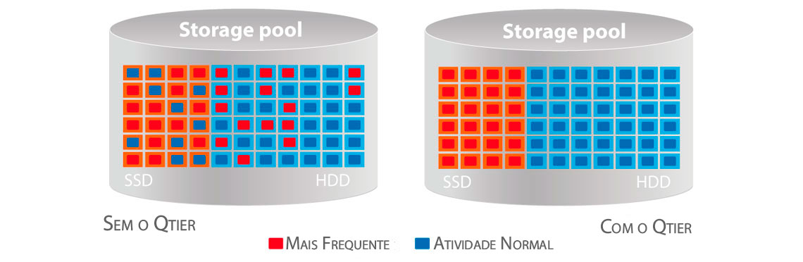 O Qtier 2.0 possui reconhecimento de I/O que habilita o armazenamento em camadas SSD com um espaço reservado do tipo cache para lidar com I/O de intermitência em tempo real, maximizando bastante as vantagens dos SSDs.
