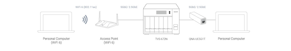 Para aprimorar seu ambiente de rede e o armazenamento, invista no TVS-672N. Para obter ainda mais velocidade adicione conectividade 5GbE ao seu notebook através de um adaptador Qnap USB 3.0 e conecte-se diretamente com seu NAS obtendo uma maior velocidade de rede.