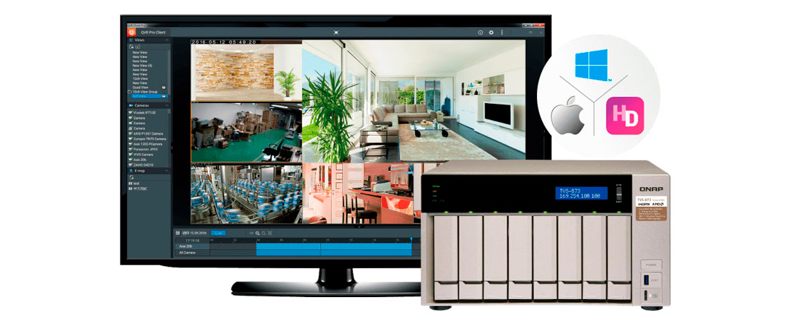 O TVS-873 suporta aplicativo QVR Pro, que integra o sistema profissional de vigilância da Qnap, possibilitando determinar espaço de armazenamento dedicado para imagens de vigilância.