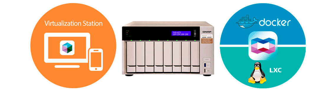Os switches virtuais aumentam consideravelmente a velocidade de transferência entre VMs, containers e storage, por meio da interface interna. O TVS-873 Qnap oferece Container Station que integra tecnologias de virtualização LXC e Docker, permite operar múltiplos sistemas Linux, assim como baixar aplicativos a partir do Docker Hub Registry. Além de suportar plataforma QIoT Containers para estruturar rapidamente um ambiente IoT e implantar na nuvem IoT privativa do usuário.