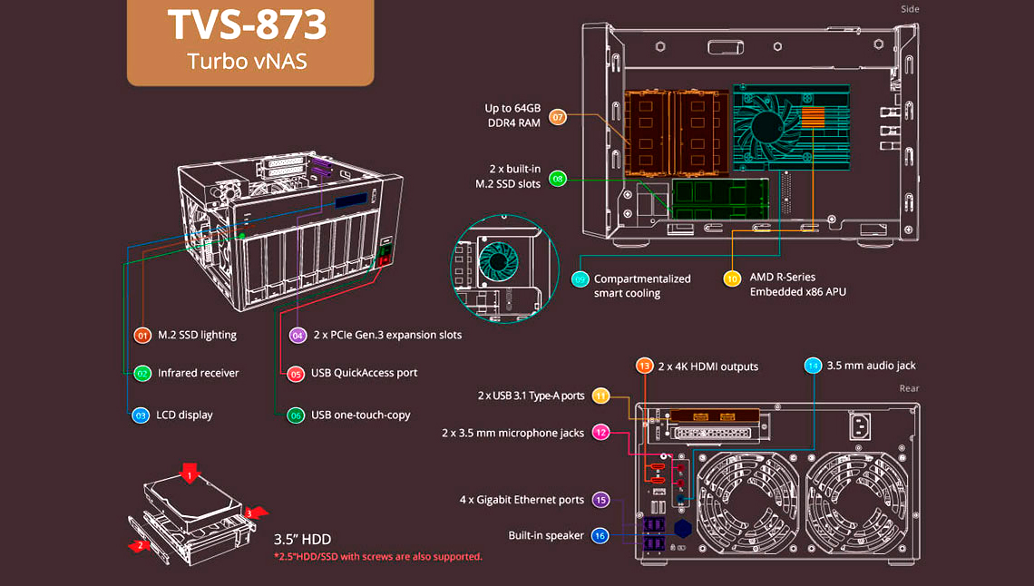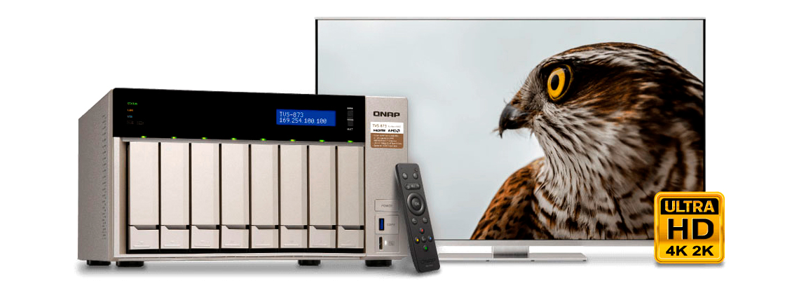 O TVS-873 oferece mecanismo de criptografia AES-NI, multimídia com saída HDMI 4K e codificação /decodificação de vídeo 4K H.264.