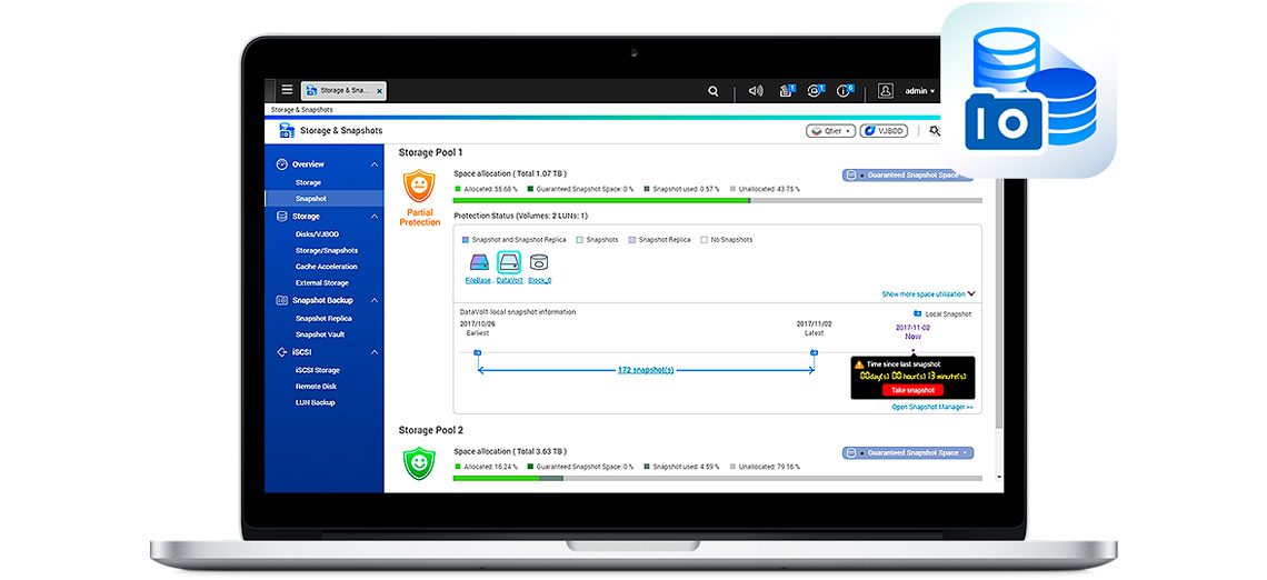 Para realizar backup e restauração de dados, o TVS-873, oferece uma ferramenta de snapshot com gerenciamento web.