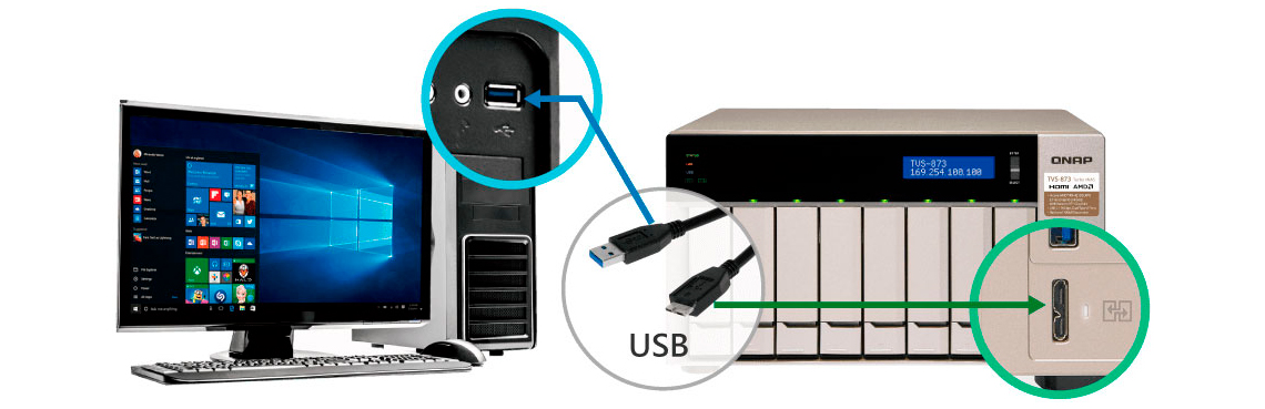 Através da tecnologia USB QuickAccess, o TVS-873 possibilita concluir a primeira instalação e configuração, proporcionando acesso direto e fácil aos arquivos armazenados no storage, sem a necessidade de conexão à rede.