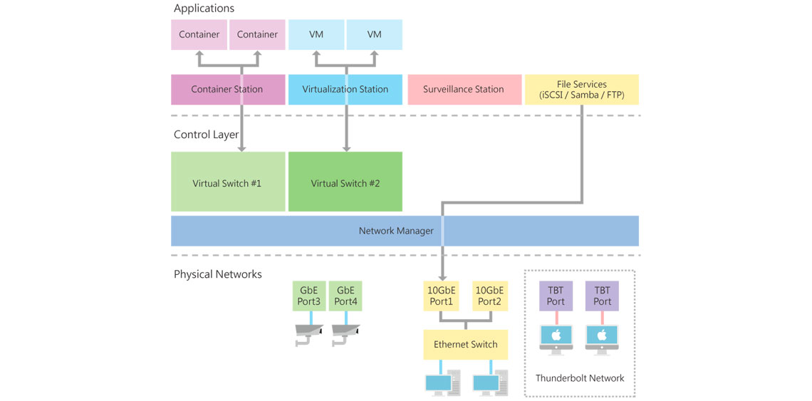 O Virtualization permite ao storage e VMs a utilizarem a mesma conexão de rede, sem limitações de redes físicas, switches virtuais de alta velocidade aumentam a transferência de dados entres VMs e NAS via interface interna.