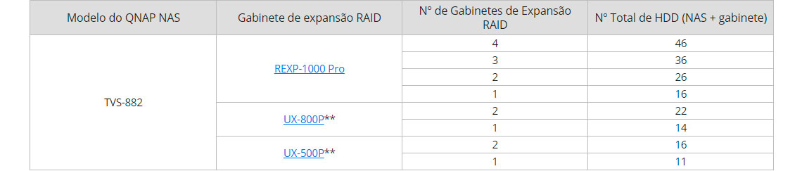 O TVS-882 pode expandir seu armazenamento ao conectar unidades de expansão RAID SAS-enabled, chegando ao total de 46 discos, ou com unidades de expansão USB 3.0 para um melhor custo benefício.