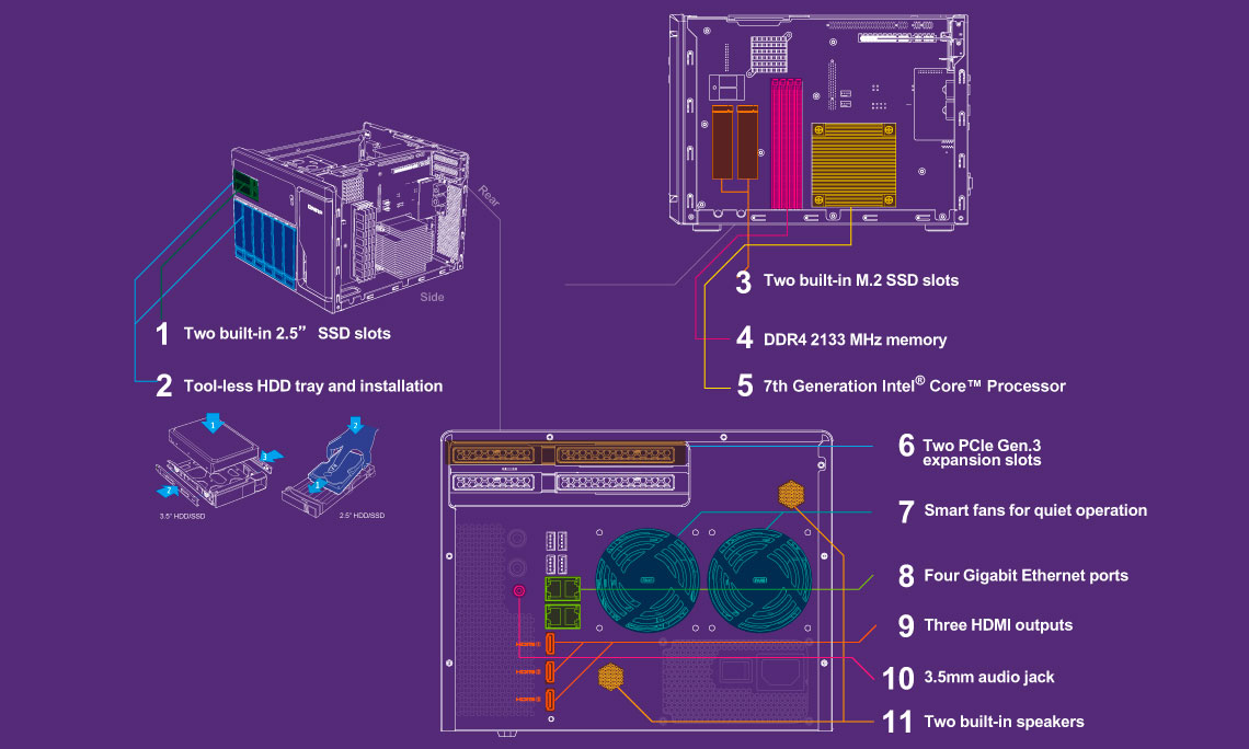 6- 2 slots PCIe Gen3: 2 slots PCIe oferecem largura de banda de 1GB/s por via com suporte para adaptadores 10GbE/40GbE, PCIe NVMe SSD, placas gráficas (AMD RAdeon R7 ou RX 480) e placas de expansão USB3.1 para mais versatilidade de hardware.