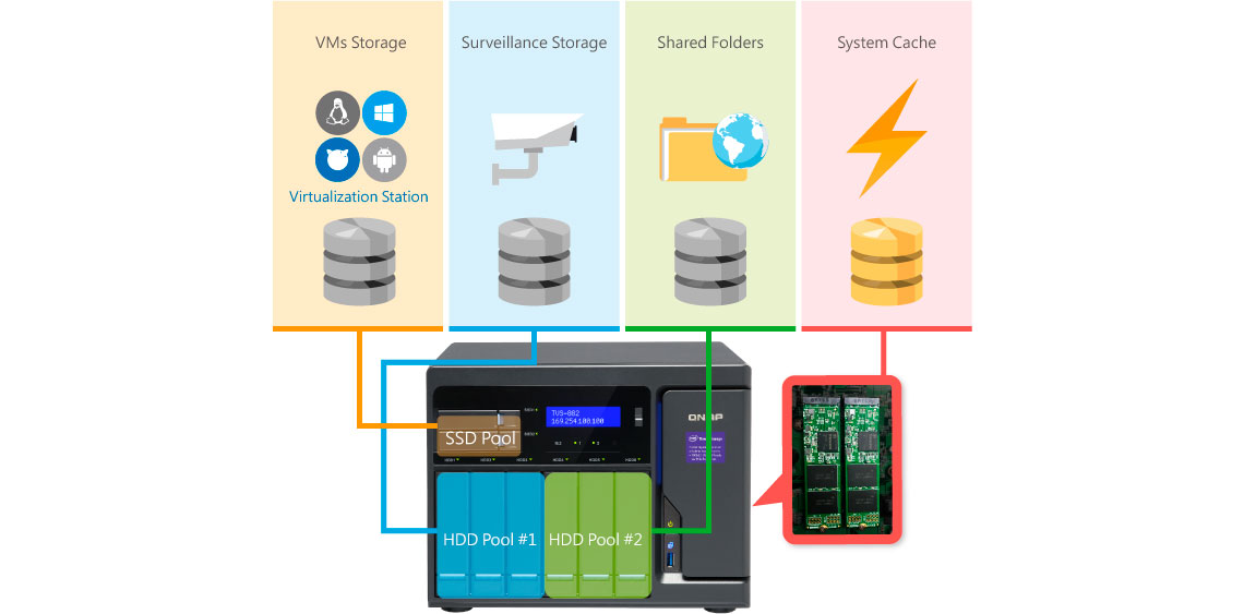 A aceleração por caching melhora a performance do sistema, e acelera operações de IOPS aleatórias como virtualização. O TVS-882 combina SSDs M.2 e de 2,5 polegadas com HDDs para um 'tiered storage' de alto desempenho.
