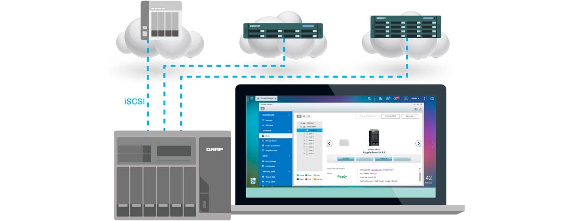 Além de utilizar unidades de expansão físicas para aumentar a capacidade do TVS-882, ele também possui o recurso VJBOD (Virtual JBOD), para conectar vários NAS entre si. Volumes iSCSI LUN podem ser montados como discos locais, e criar pools de armazenamento para diferentes usos, por exemplo, criar e reverter snapshots ou indexar arquivos multimídia.