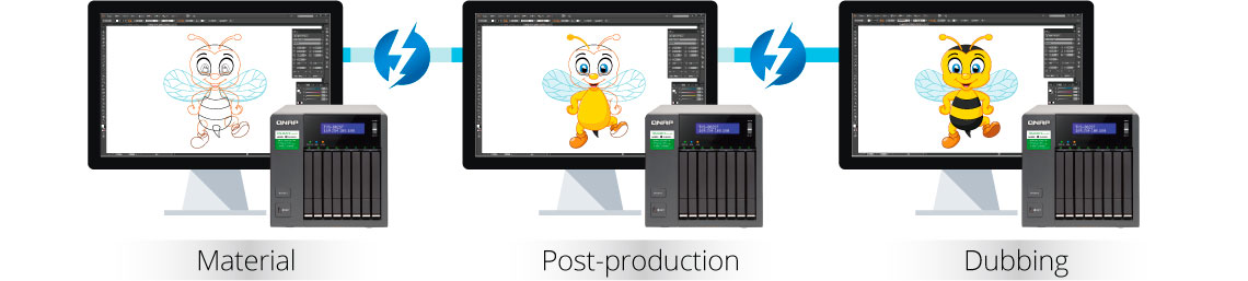 Nessa situação, pode ser útil conectar em cadeia 6 unidades TVS-882ST3 adicionais ao equipamento original, e organizar cada NAS para estágios de fluxo de trabalho dedicados, enquanto a outra porta Thunderbolt 3 é conectada à uma estação de trabalho para acessar facilmente grandes unidades de tamanho grande, como os arquivos de vídeo.