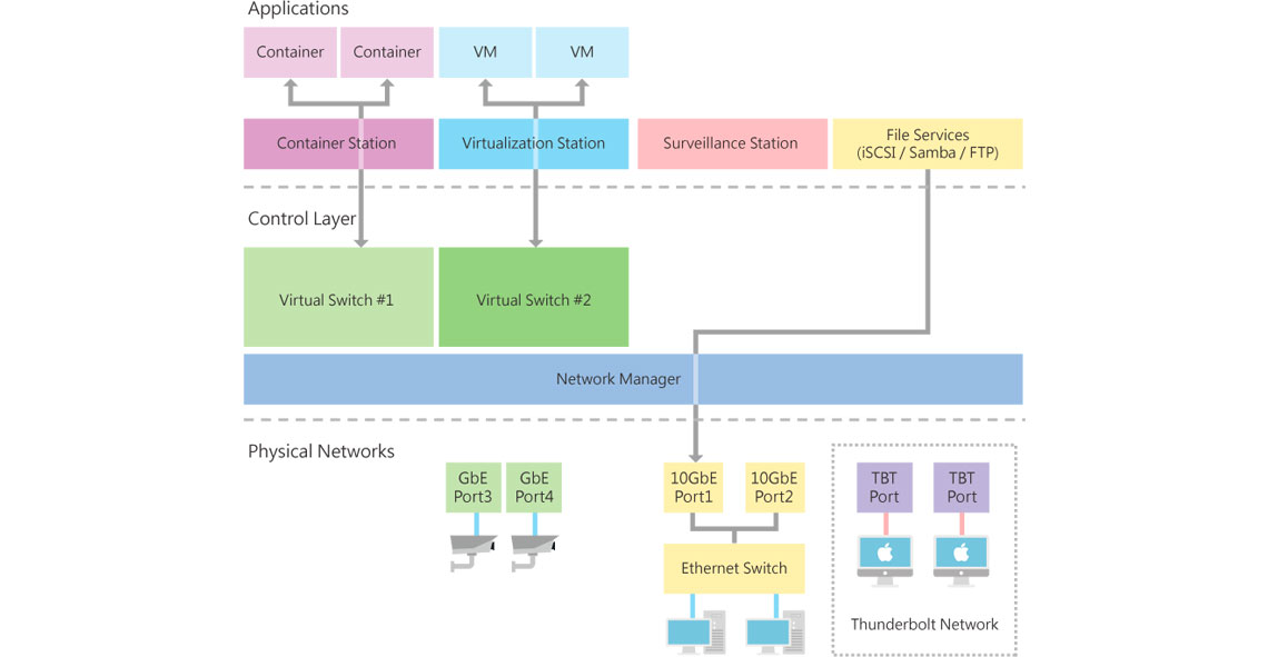 O Virtualization Station permite ao TVS-882T e VMs utilizarem a mesma conexão de rede, sem limitações de redes físicas, switches virtuais de alta velocidade aumentam a transferência de dados entres VMs e NAS via interface interna.