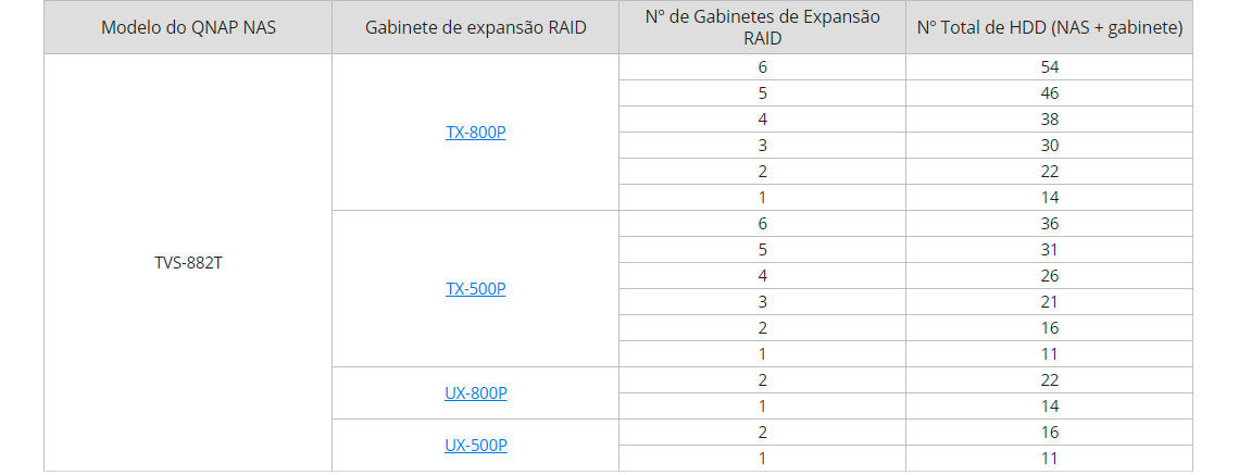 Para desfrutar de uma grande capacidade de armazenamento, o TVS-882T pode ser conectado com até seis unidades de expansão via daisy chain, para até 54 drives de capacidade, com compartilhamento via diferentes interfaces.