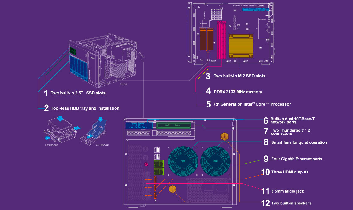 O TVS-882T integra uma CPU Intel Celeron core i5 e 16GB de memória RAM DDR4, sendo capaz de rodar tarefas pesadas sem interrupções. Como um NAS multi-tarefa compacto, combinando entradas Thunderbolt 2 e 10GbE, dando flexibilidade para utilizar diferentes conexões de alta velocidade.