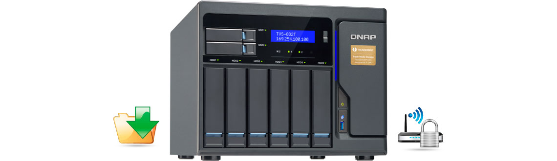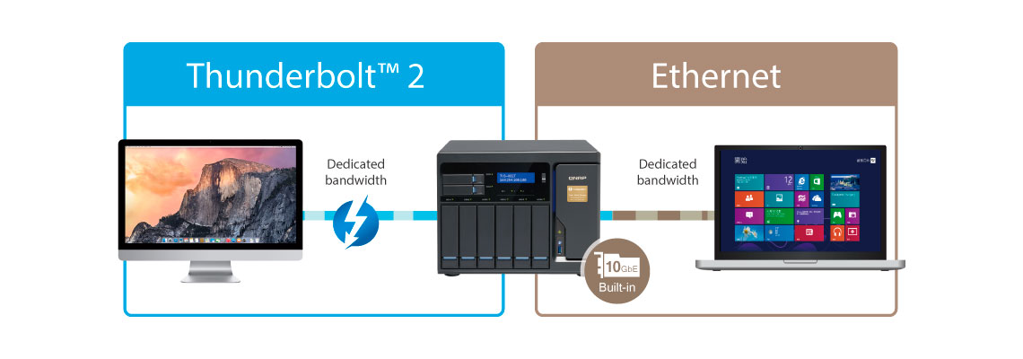 Com as duas entradas Thunderbolt 2 no TVS-882T, os usuários têm uma maior flexibilidade para conectar o storage à diferentes dispositivos.