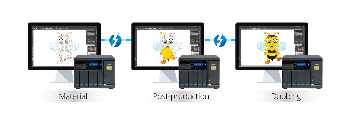 Ao adicionar uma estação de trabalho Mac no TVS-882T via cabo Thunderbolt 2, é possível trabalhar com edição de vídeo com banda de até 20GB/s, enquanto outro cabo é utilizado para aumentar o armazenamento com unidades de expansão.