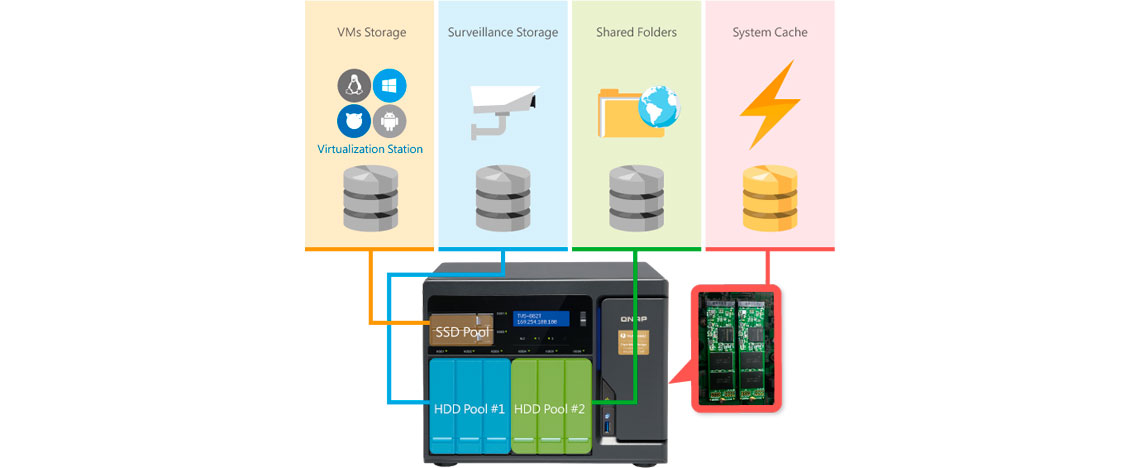 A aceleração por caching melhora a performance do sistema, e acelera operações de IOPS aleatórias como virtualização. O storage integra SSDs M.2 e de 2,5 polegadas com HDDs para um tiered storage de forte desempenho.