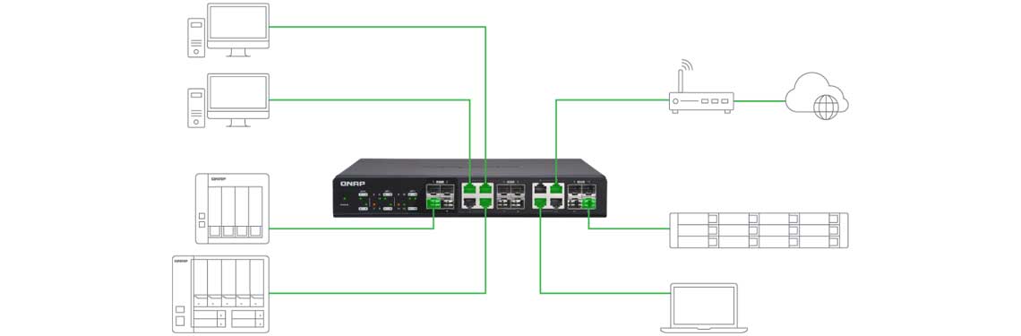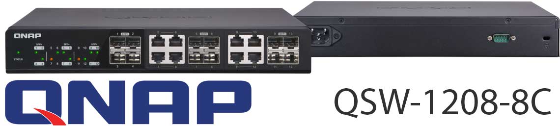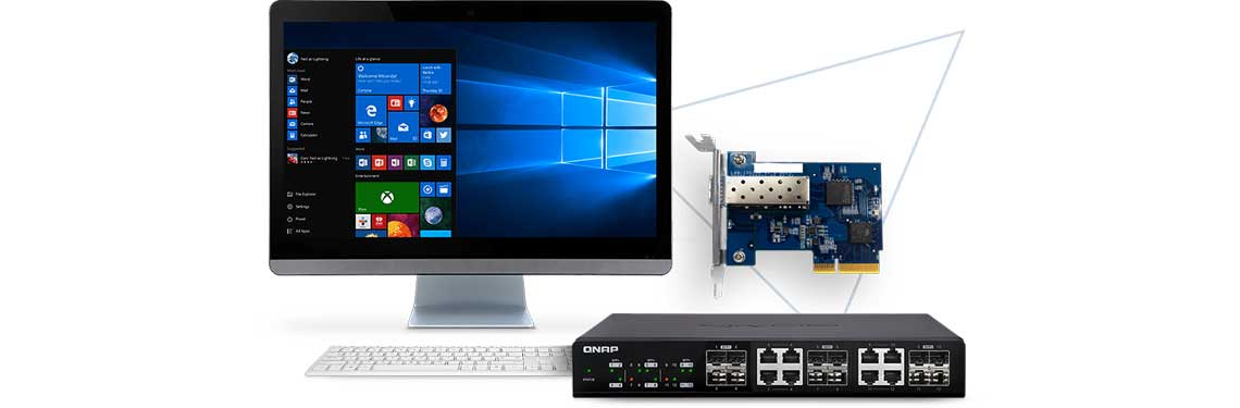 O switch QSW-1208-8C permite a conexão de estações de trabalho ou servidores com capacidade de 10GbE para um ambiente de rede otimizado para produtividade com escalabilidade econômica. A QNAP disponibiliza também uma placa de expansão de rede 10GbE PCIe para PCs Windows/Linux adicional para aproveitar as vantagens de ambientes LAN de alta velocidade.