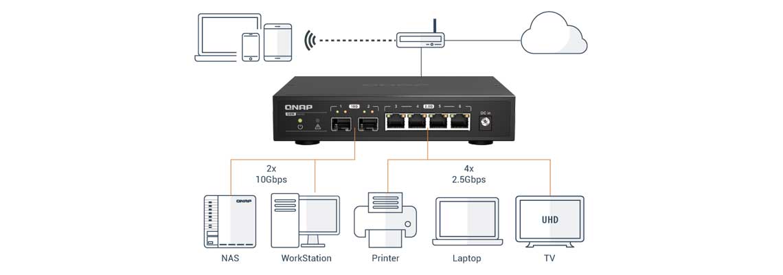 O QSW-2104-2S-A possui 6x conexões, sendo 2x portas SFP+ de 10GbE e 4x RJ45 de 2,5GbE, permitindo-lhe atualizar o ambiente de rede ligando uma vasta de dispositivos com diferentes requisitos de largura de banda.