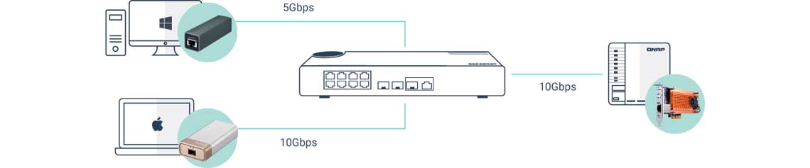 As placas de expansão de rede 10GbE, os adaptadores Thunderbolt 3 para 10GbE e os adaptadores de rede USB 3.2 Gen 1 para 5GbE da QNAP podem ser usados com o QSW-308-1C para criar um ambiente de rede completo de alta velocidade para maximizar o desempenho de tarefas de edição de fotos/vídeo, virtualização, transferências de dados em arquivos grandes e outras operações com alta demanda de largura de banda.