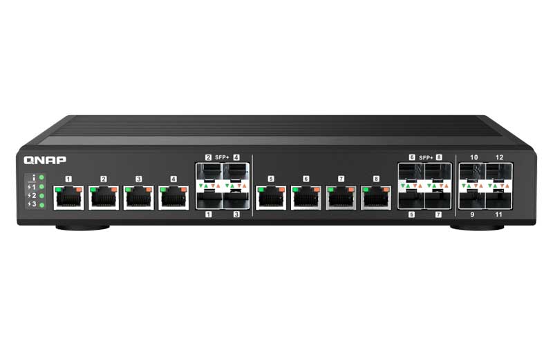O QSW-IM1200-8C possui 12 conexões, sendo 4x portas de fibra SFP+ de 10 GbE e 8x portas combinadas SFP+/RJ45 de 10GbE e suporta comutação de camada 2 e gestão de rede para fornecer uma solução de gestão de rede de nível básico fácil de utilizar.