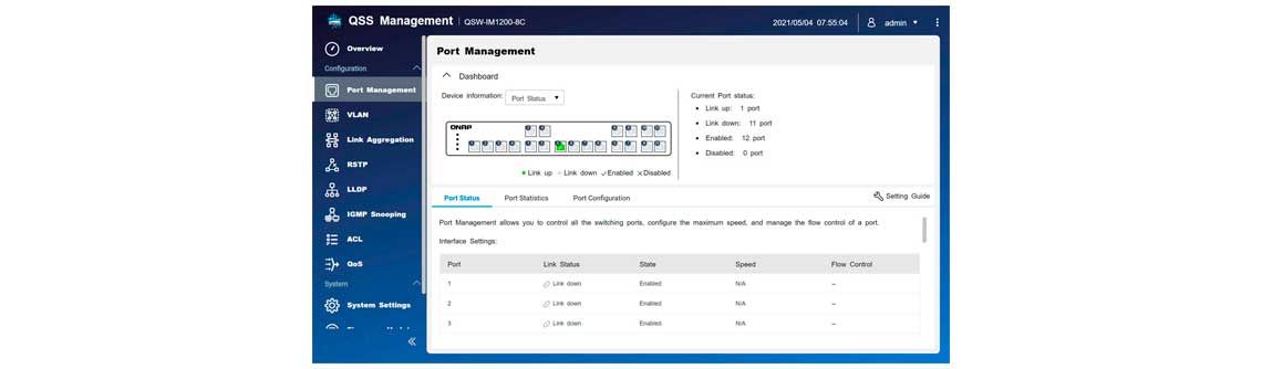 O QSS fornece um painel geral, gestão de portas e guia de configuração para ajudar os utilizadores a controlar as redes de camada 2.