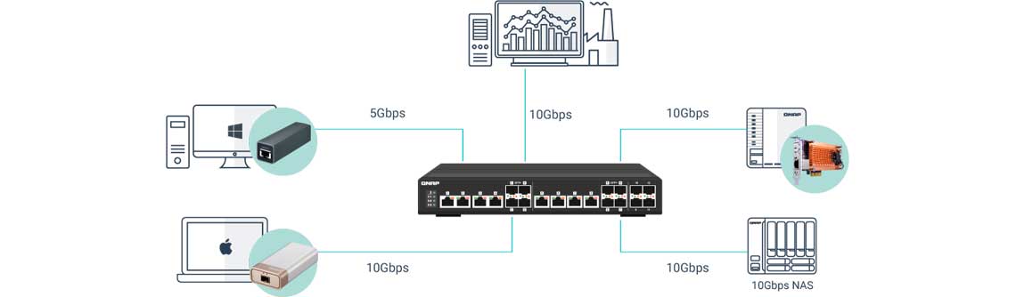 Todos eles podem ser utilizados com o QSW-IM1200-8C para impulsionar o desempenho da virtualização, vigilância, impressão 3D, transferências de dados de grandes dimensões e outras tarefas que exijam largura de banda em ambientes industriais de rede de alta velocidade.