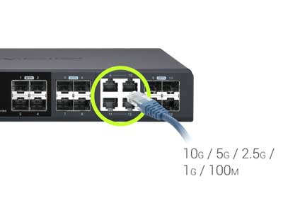 O QSW-M1204-4C também apresenta compatibilidade com as tecnologias 10GbE e NBASE-T, com até cinco velocidades (10G/5G/2,5G/1G/100M). As portas combinadas SFP+/RJ45 (cobre) oferecem velocidades de transmissão mais altas com cabos existentes. Dependendo dos tipos e dos comprimentos dos cabos, velocidades diferentes podem ser alcançadas para transferências de dados mais rápidas e eficientes.