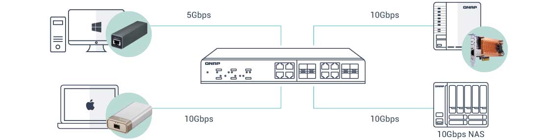 A QNAP liderou a adoção de 10GbE em sistemas NAS com portas SFP+ 10GbE e 10GBASE-T integradas ou sistemas NAS com slots PCIe compatíveis com adaptadores de rede 10GbE.