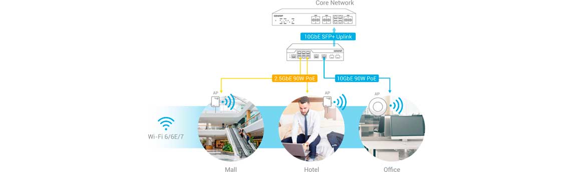 Um switch que suporta 2,5 GbE+: Os switches 10GbE/2,5GbE suportam 2,5G/1G/100M e permitem conectar várias desktops e dispositivos para colaboração de alta velocidade em ambientes com muitos dispositivos.