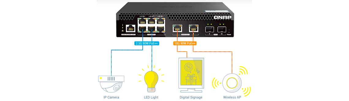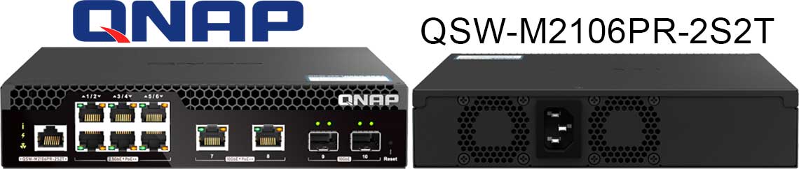 O QSW-M2106PR-2S2T possui 10 entradas, sendo 6x portas PoE++ de 90 watts de 2,5GbE, 2x PoE++ de 90 watts de 10GbE e 2x portas de fibra SFP+ de 10 GbE.